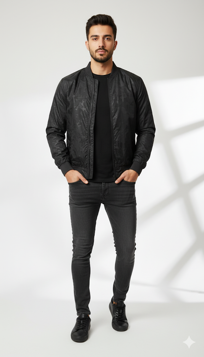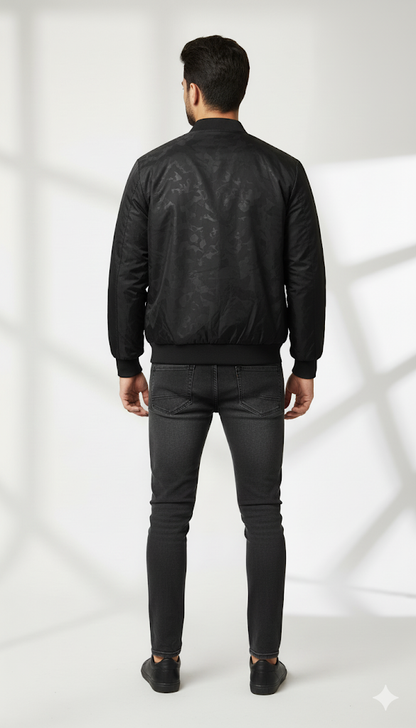 This black bomber jacket features a subtle, tonal camouflage pattern in the fabric, adding a textural, modern edge to the classic zip-up style.