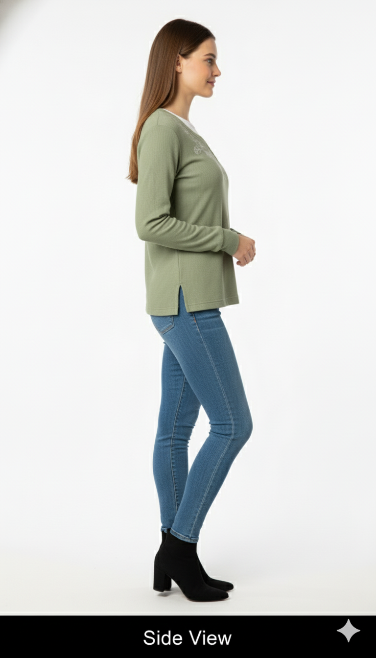 This is a Sage Green Rib-Knit Henley Top for women, detailed with delicate white floral embroidery across the yoke for a charming, vintage-inspired look.